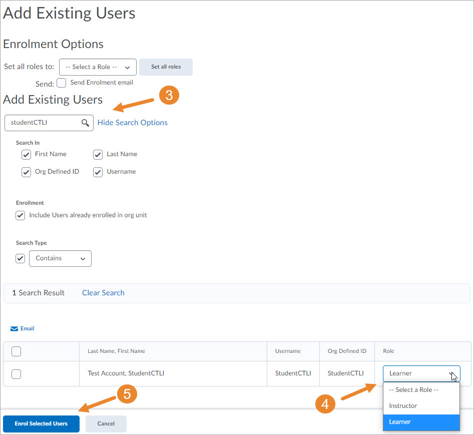 4. After you’ve found the individual to add in the search list results, check off the box in front of their name and assign them a role in the course from the dropdown menu (Learner, Read-Only or Instructor)